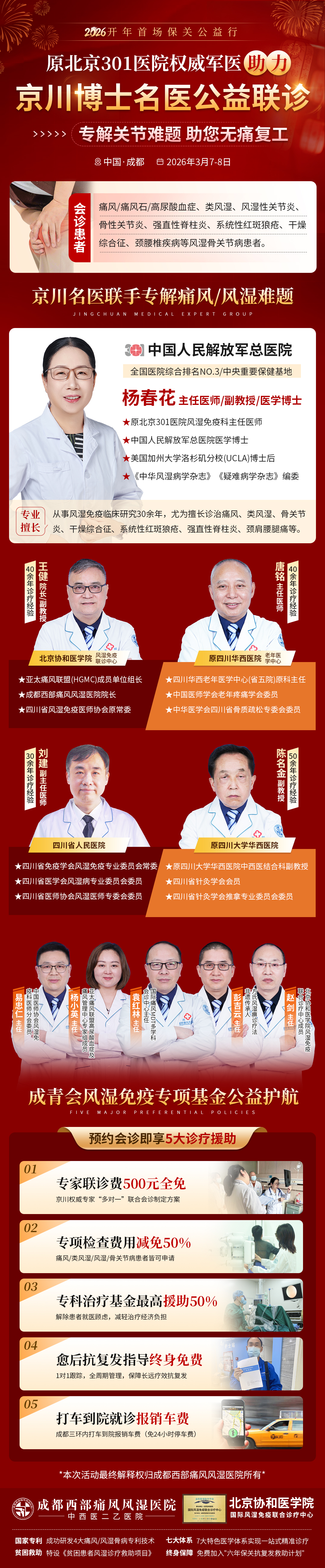 为帮助广大患者抓住年后诊疗黄金期,成都西部痛风风湿医院正式启动「2026开年首场保关公益行」,特邀原中国人民解放军总医院(北京301医院)风湿免疫科权威专家杨春花教授亲临成都,领衔京川博士名医团,为痛风、风湿骨关节病患者提供精准诊疗方案,助力大家无痛复工、安心生活。